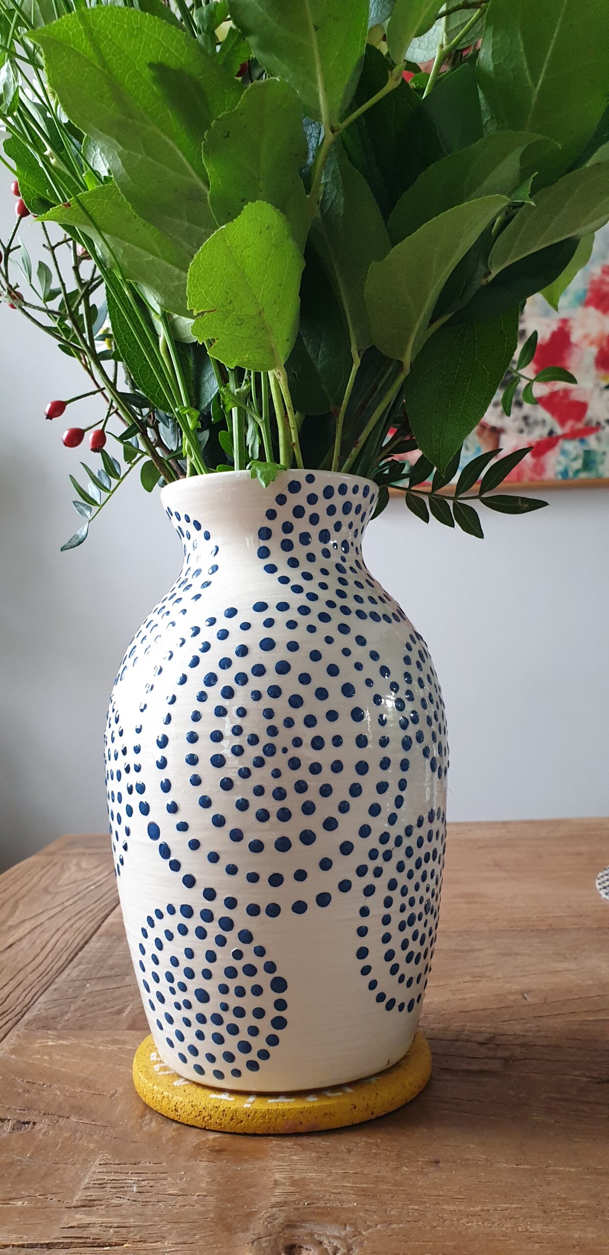 Décor blanc avec pois bleus et bleu avec pois blanc.